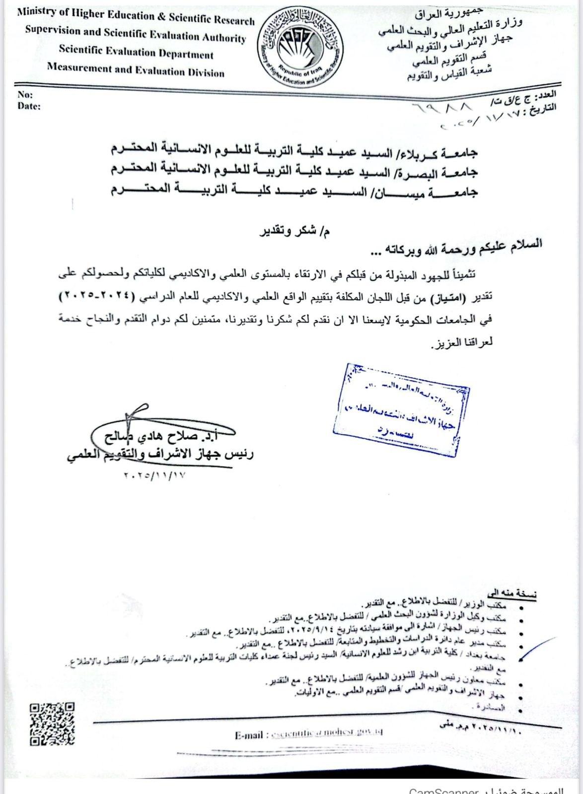 حققت كلية التربية للعلوم الإنسانية في جامعة البصرة إنجازاً بارزاً بحصولها على تقدير (امتياز) في التقييم السنوي للواقع العلمي والأكاديمي للجامعات الحكومية للعام الدراسي 2024-2025، في إطار تقييمات أجرتها اللجان المختصة بوزارة التعليم العالي والبحث العلمي.