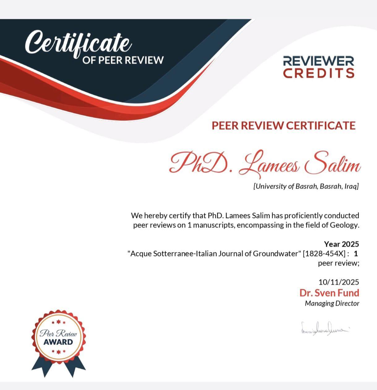 اختيرت التدريسية في مركز علوم البحار في جامعة البصرة الدكتورة لميس سالم عبد الحسين مقيماً علمياً للبحوث المنشورة في مجلة ACQUE SOTTERRANEE journal