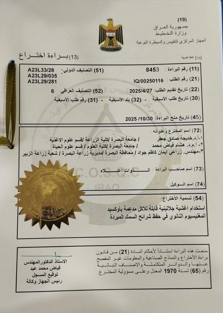 حصلت التدريسية في كلية الزراعة بجامعة البصرة، الدكتورة خديجة صادق جعفر، على براءة اختراع لابتكارها تقنية لحفظ شرائح السمك المبردة باستخدام أغشية جيلاتينية قابلة للأكل مدعمة بأوكسيد المغنيسيوم النانوي.