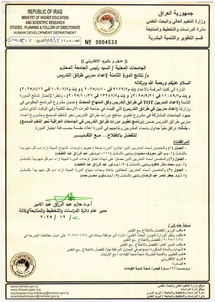 تدريسيون من جامعة البصرة يحصلون على شهادة المدرب المعتمد من وزارة التعليم العالي والبحث العلمي