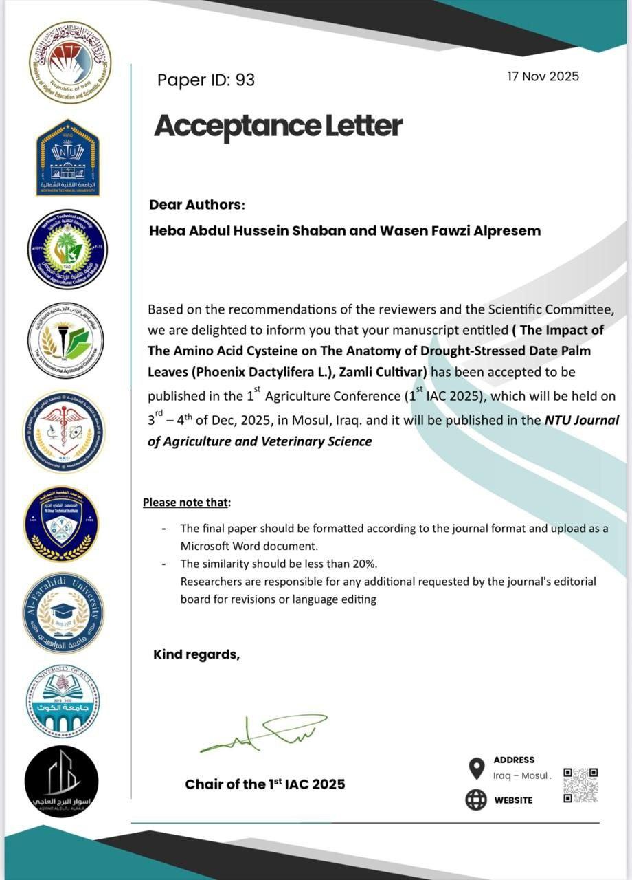 وقدمت الدكتورة وسن بحثها العلمي الموسوم "دور الحامض الأميني السيستين في التغيرات التشريحية لأوراق نخيل التمر صنف الزاملي تحت ظروف إجهاد الجفاف" ضمن محور البحوث العلمية الحديثة في مجال تنمية القطاع الزراعي.