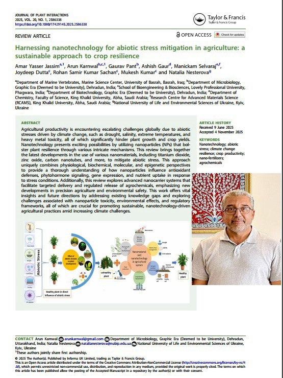 واستعرضت المقالة أحدث تطبيقات المواد النانوية في التخفيف من الإجهاد اللا أحيائي مع تسليط الضوء على آليات تعزيز الدفاعات المضادة للأكسدة وتنظيم الإشارات الهرمونية والتعبير الجيني وتحسين امتصاص العناصر الغذائية، كما ناقشت المقالة التطورات الحديثة في أنظمة النواقل النانوية للزراعة الدقيقة إلى جانب التحديات المتعلقة بالسمّية والسلامة البيئية والأُطر التنظيمية بما يدعم التوجه نحو تعزيز الممارسات الزراعية المستدامة القائمة على تكنولوجيا النانو في ظلّ التحديات المناخية المتزايدة.