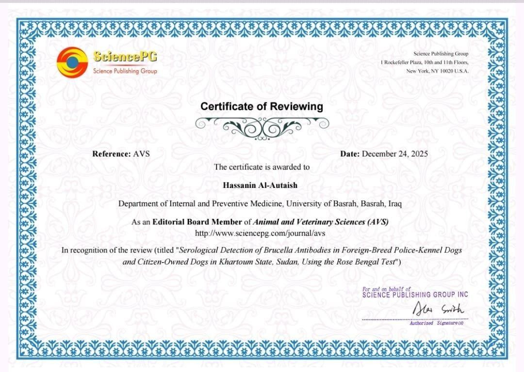 اُختير التدريسي في كلية الطب البيطري بجامعة البصرة، الدكتور حسنين هشام ناصر، مقيماً علميّاً لمجلة Animal and Veterinary Science.
