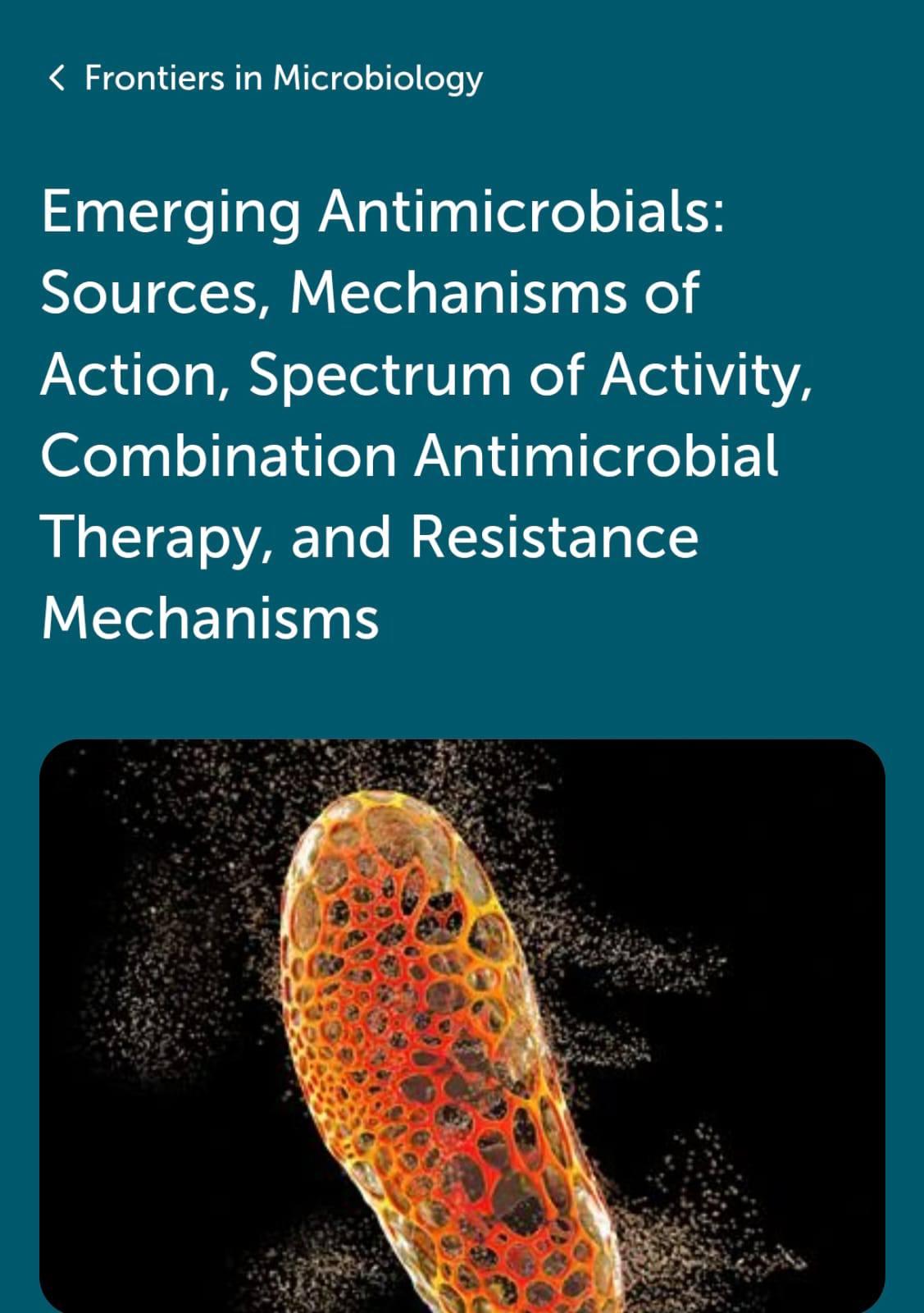 ضمن كتاب Emerging Antimicrobials: Sources, Mechanisms of Action, Spectrum of Activity, Combination Antimicrobial Therapy, and Resistance Mechanisms، وصدر الكتاب عن دار النشر العالمية Frontiers ضمن سلسلة Frontiers in Microbiology وهي من المجلات العلمية الرصينة المصنفة ضمن Q1 إذ يبلغ معامل التأثير 5.2 فيما بلغ تقييم الموقع 6.5