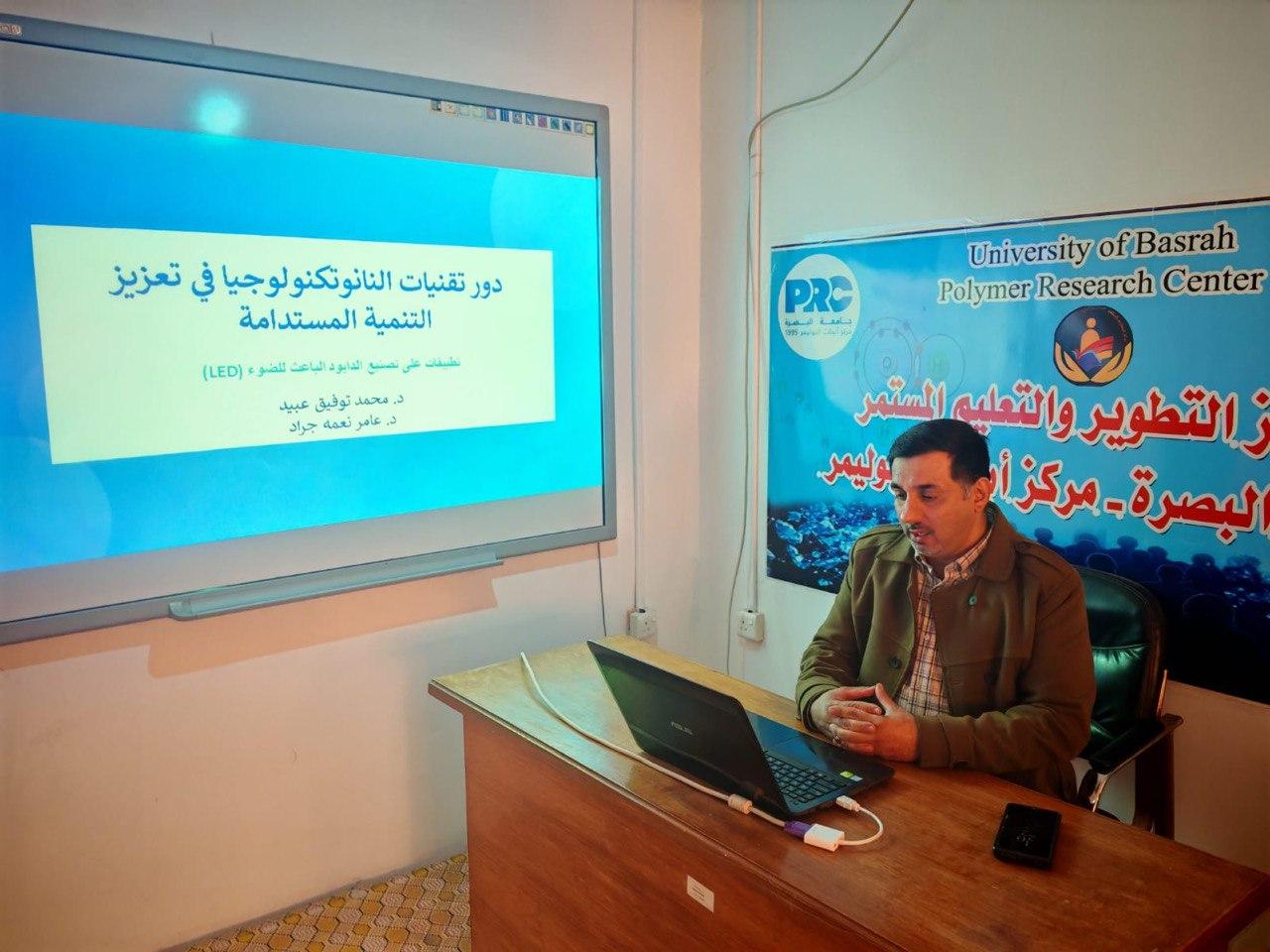 نظم مركز ابحاث البوليمر في جامعة البصرة ورشة عن (دور تقنيات النانوتكنولوجيا في تعزيز التنمية المستدامة: تطبيقات على تصنيع الدايود الباعث الضوئي).