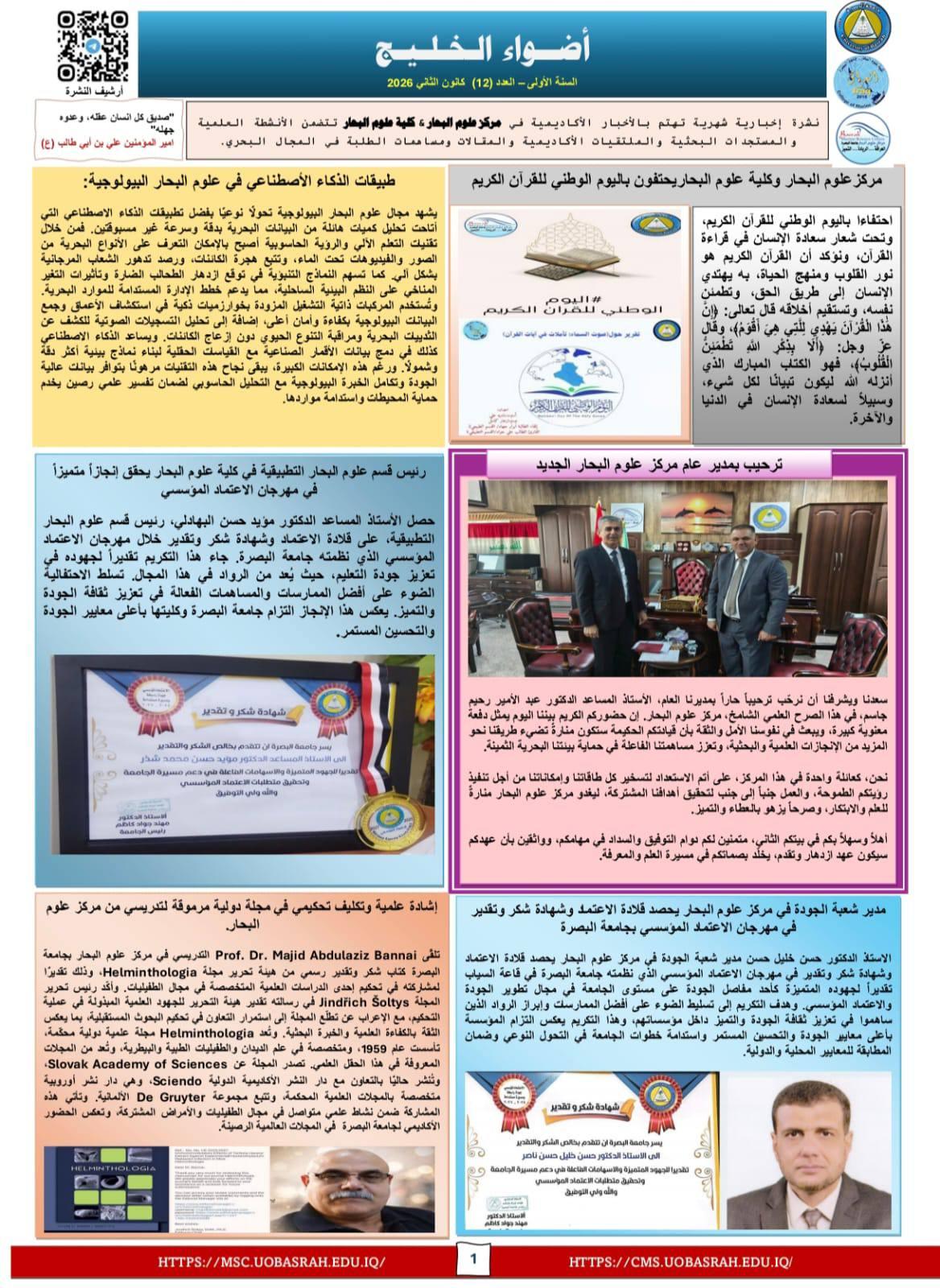 من أجل دعم خطط التنمية المستدامة في الحفاظ على التنوع البحري أصدر مركز علوم البحار وكلية علوم البحار في جامعة البصرة العدد الثاني عشر من النشرة الشهرية (أضواء الخليج) التي تهتم بالانشطة العلمية والمقالات والمستجدات البحثية والملتقيات الاكاديمية فضلاً عن مساهمات الطلبة المتنوعة.
