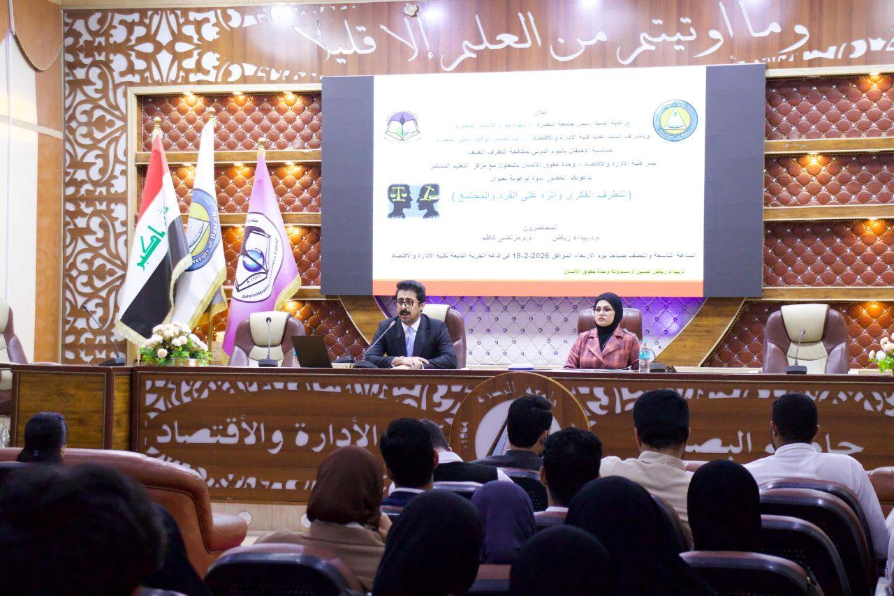 نظّمت كلية الإدارة والاقتصاد، وبالتعاون مع مركز التطوير والتعليم المستمر في جامعة البصرة، ندوةً علمية بعنوان التطرف الفكري وأثره على الفرد والمجتمع.