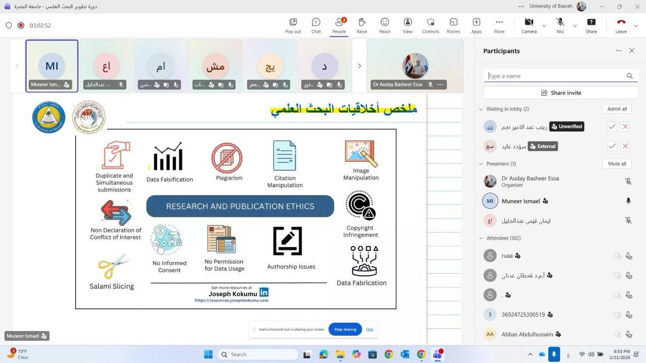 نظم مركز ابن سينا للتعليم الالكتروني في جامعة البصرة ورشة عمل افتراضية عن اخلاقيات البحث العلمي ضمن دورة لتطوير البحث العلمي في الجامعة بمشاركة اساتذة وباحثين.
