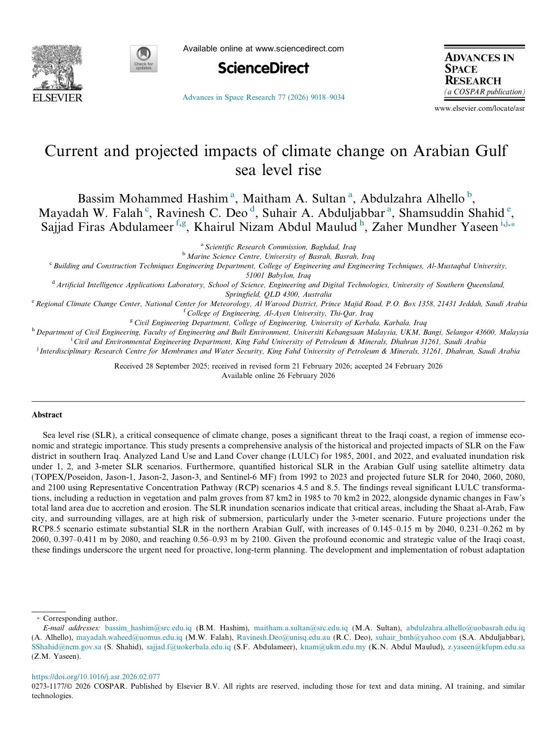 نشر التدريسي في مركز علوم البحار بجامعة البصرة الدكتور عبد الزهرة عبد الرسول الحلو بحثًا علميًا مشتركًا مع مجموعة من الباحثين بعنوان Current and projected impacts of climate change on Arabian Gulf sea level rise