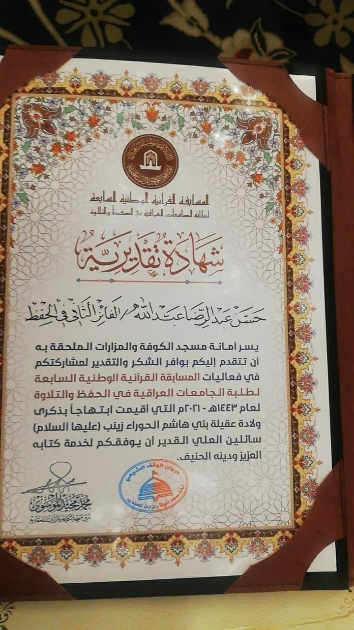 واظهرت نتائج التصفيات نيل جامعة البصرة المرتبة الثانية في فقرة حفظ القرآن حيث كانت من نصيب القارئ حسن عبد الرضا من كلية طب الاسنان وفي التلاوة حسين اسماعيل نمر نافسوا جامعات العراق في المسابقة القرآنية في مسجد الكوفة بالحفظ والتلاوة.