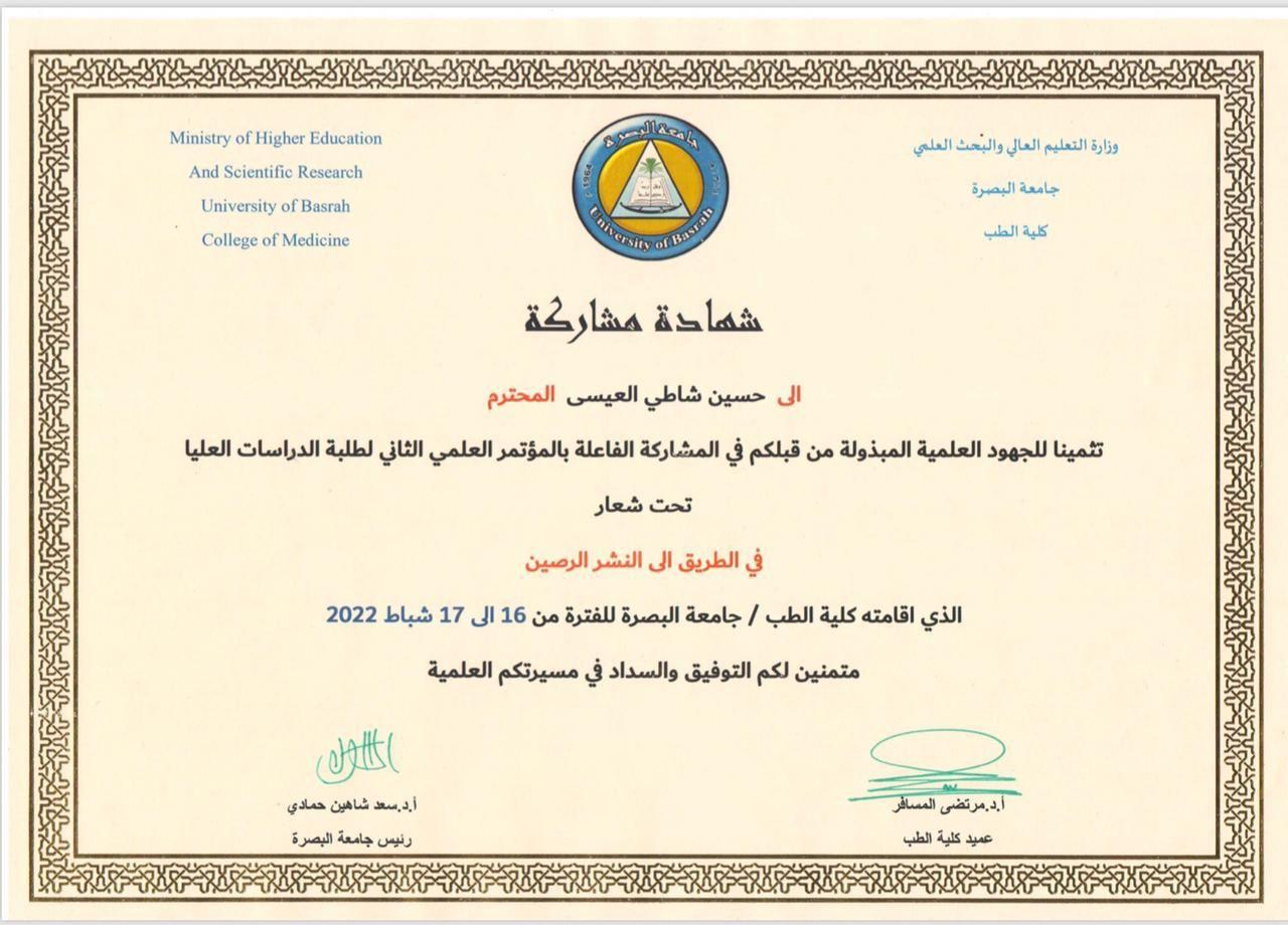 والجدير بالذكر إن شاطي حصل على شهادة مشاركة بالمؤتمر تثمينا لجهوده العلمية ومشاركته الفاعلة في المؤتمر العلمي الذي اقيم تحت شعار (في الطريق الى النشر الرصين).