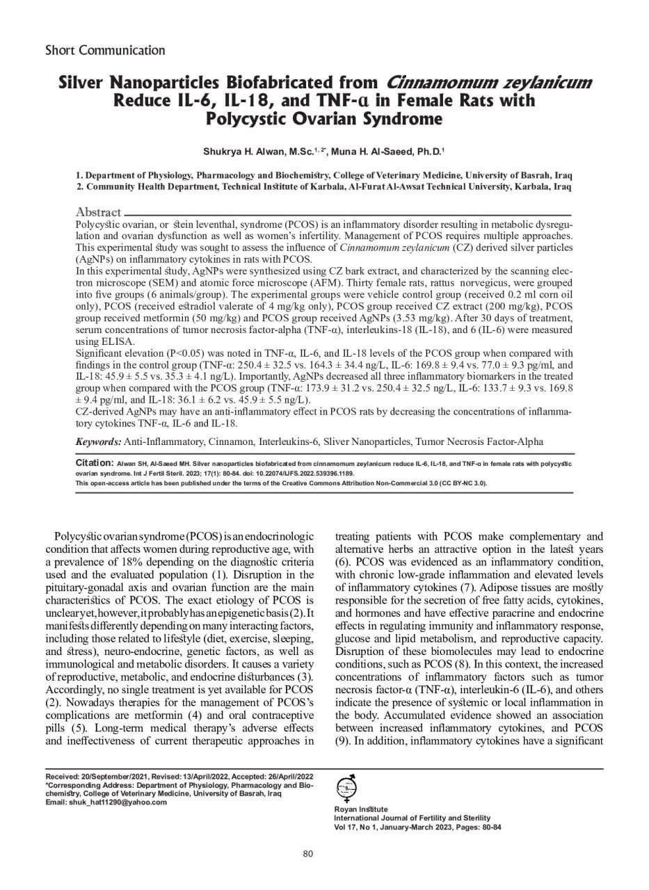 وتضمنت الدراسة التي نشرت بمجلة International Journal of Fertility and Sterility وتعتبر مجلة عالمية مصنفة ضمن مستوعبات سكوبس Q2 وكلاريفيت إيجاد طريقة جديدة لعلاج متلازمة تكيس المبايض المتعددة المستحدثة بواسطة Estradiol valerate في إناث الجرذان باستخدام دقائق الفضة النانوية المصنعة حيوياً بواسطة مستخلص لحاء القرفة الكحولي ومقارنتها بالعلاج التقليدي metformin.