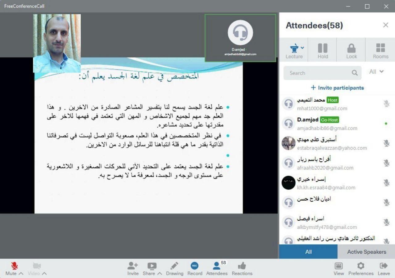 وتضمنت المحاضرة التي قدمها الدكتور امجد عبدالرزاق حبيب ، شرحا مفصلا عن التواصل وصوره ومعوقاته والتركيز على التواصل غير اللفظي ( لغة الجسد ) وتأثيرها على كل جانب من جوانب العملية التعليمية المتعلم وتفعيل تعلمه ، المدرس وادارة الصف والتعامل مع مجموعات كبيرة كما تضمنت انواع الحركات والايماءات التي يستخدمها المدرس في درسه