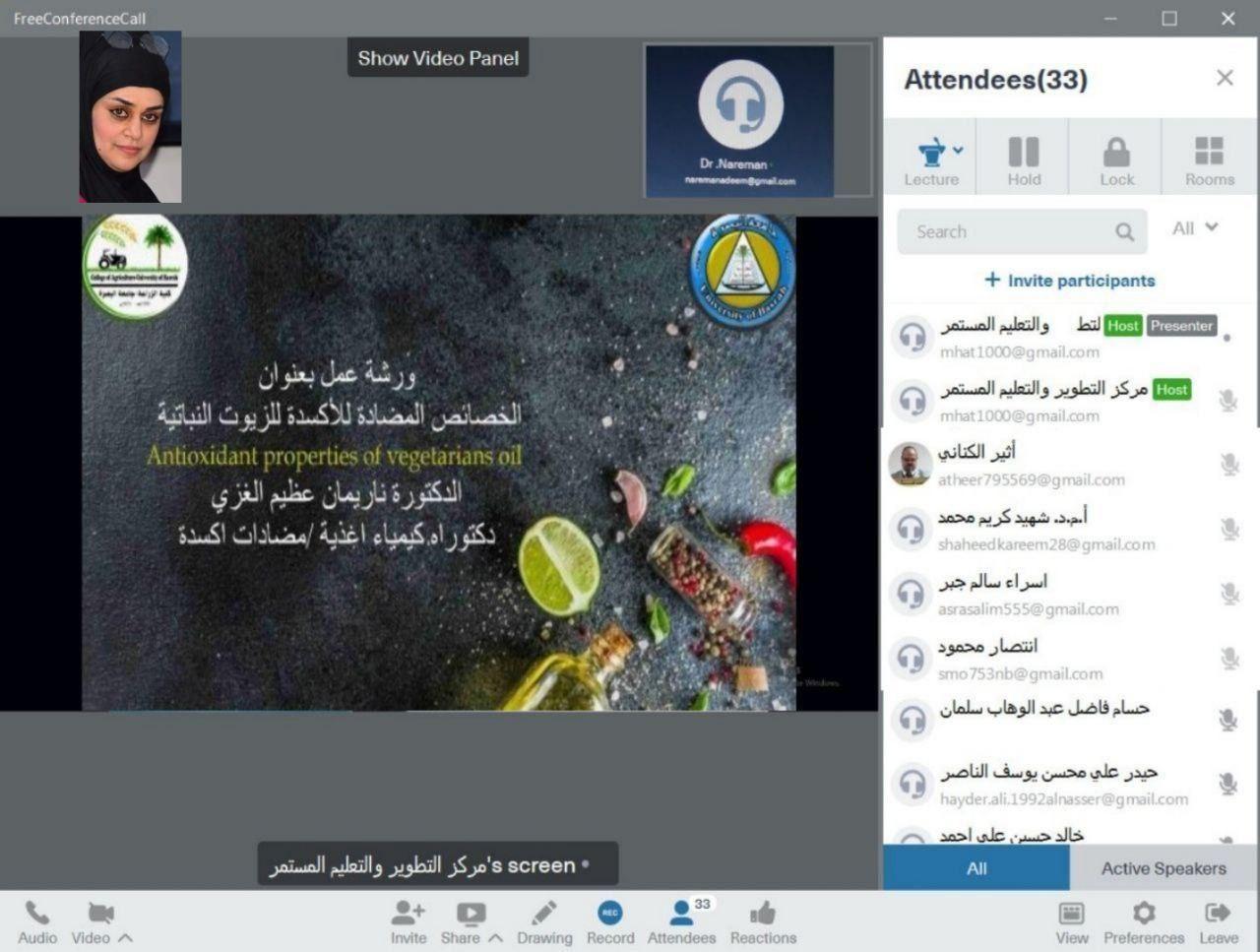 وتضمنت الورشة التي قدمتها الدكتورة ناريمان عظيم الغزي ، تناقش اهم الاجراءات المتبعة لتحسين التوافر الحيوي للبذور الزيتية والعوامل المهمة التي تعيق الامتصاص في الجسم و بيان اهم طرق استخلاص البذور الزيتية وتنقيتها والطرق المثالية للاستخلاص و بيان تاثير اساليب الطبخ المختلفة على الجزيئات المضادة للأكسدة .