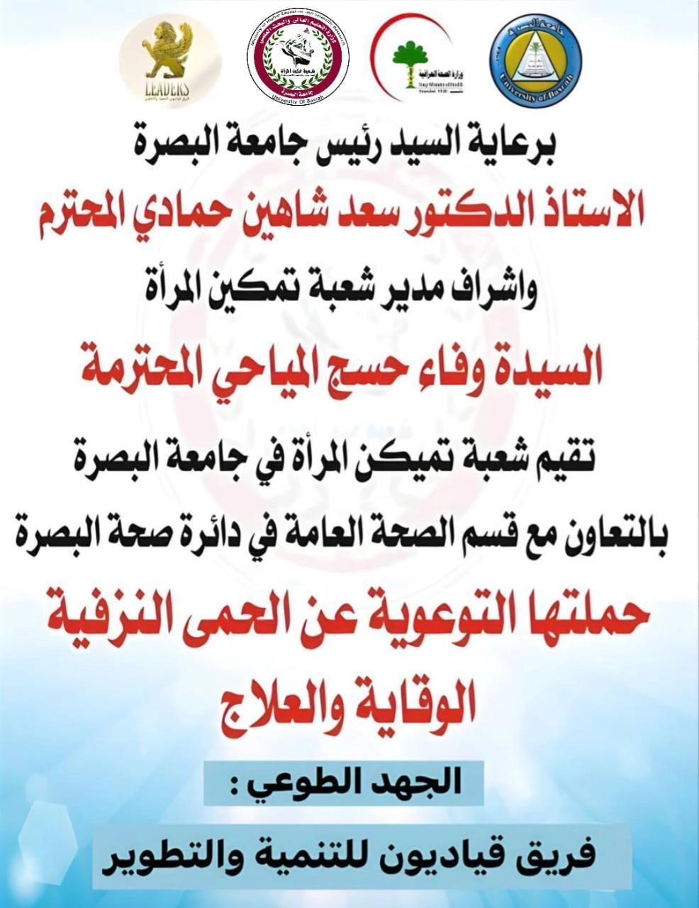 ايمانا منا بضرورة الدور الفاعل لجامعة البصرة في توعية المجتمع والمساهمة الفاعلة في وقاية المجتمع ونظرا لخطورة مرض الحمى النزفية وانتشاره في بعض مناطق البصرة والمناطق الريفية خصوصا ولزيادة التعامل مع الماشية في عيد الأضحى المبارك تباشر شعبة تمكين المرأة في جامعة البصرة بالتعاون مع قسم الصحة العامة و فريق قياديون للتنمية والتطوير بحملاتها التوعوية من محاضرات ميدانية وتوزيع الملصقات والبروشورات التحذيرية والوقائية على مربي المواشي والحيوانات المنزلية والملامسين لتلك الشريحة من السكان اضافة الى المجازر الرسمية وغير الرسمية خدمة للمواطن البصري الكريم و حمايته وتوعيته لتجنب انتشار الامراض والاوبئة في محافظتنا العزيزة .