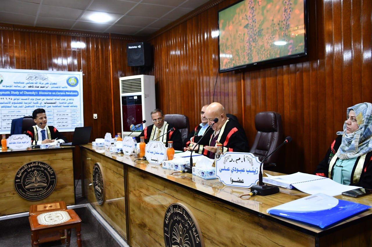 ناقشت رسالة ماجستير في كلية التربية للعلوم الانسانية بجامعة البصرة دراسة تداولية لخطاب جومسكي حول جائحة كورونا.
