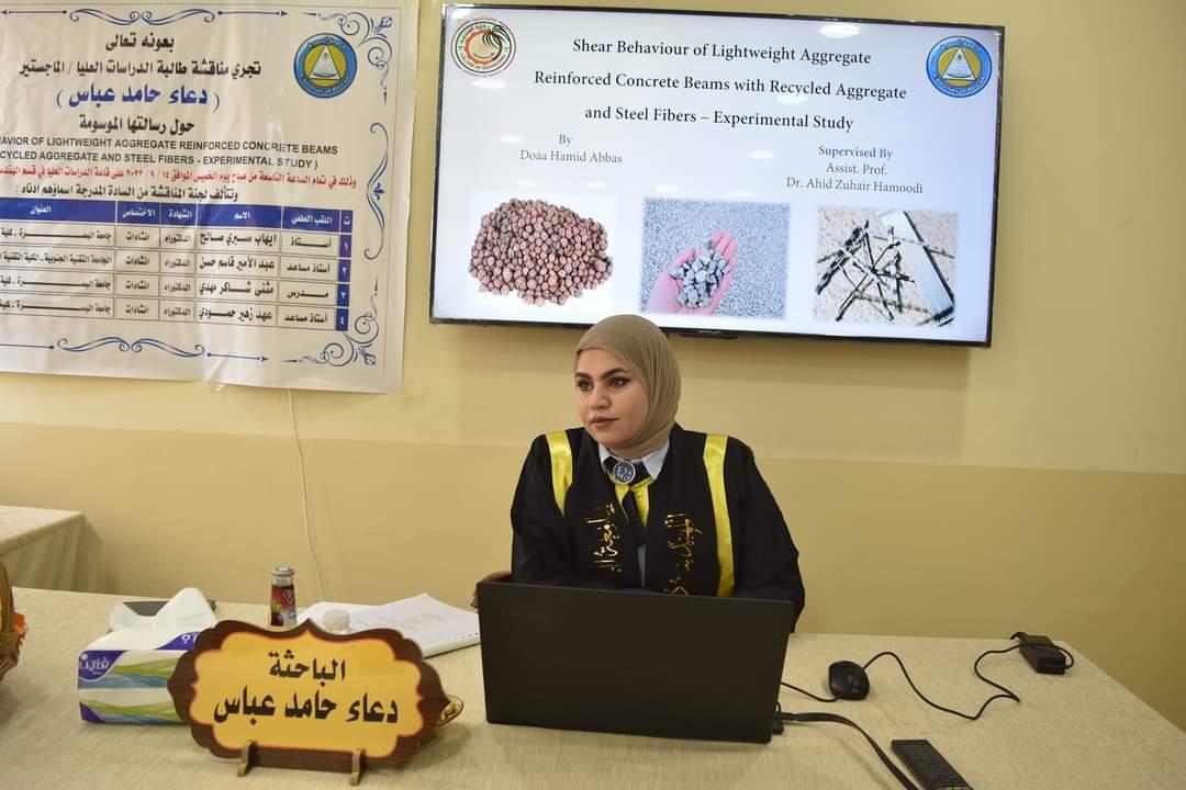 ناقشت رسالة ماجستير في كلية الهندسة بجامعة البصرة سلوك القص للعتبات الخرسانية المسلحة ذات الركام الخفيف الوزن مع الركام المعاد تدويره والالياف الفولاذية - دراسة تجريبية .