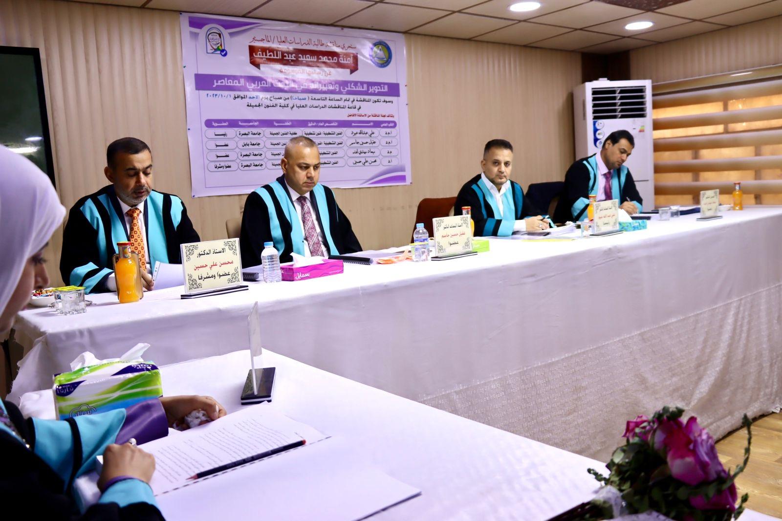 ناقشت رسالة ماجستير في كلية الفنون الجميلة بجامعة البصرة التحوير الشكلي وتعبيراته في النحت العربي المعاصر.