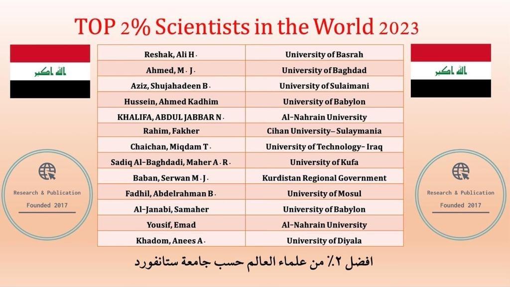 البروفسور علي حسين رشك يتربع على المركز الاول ضمن افضل الباحثين حول العالم