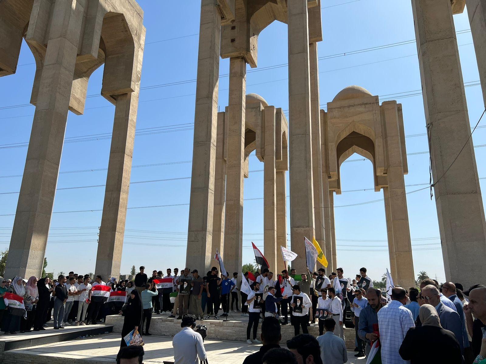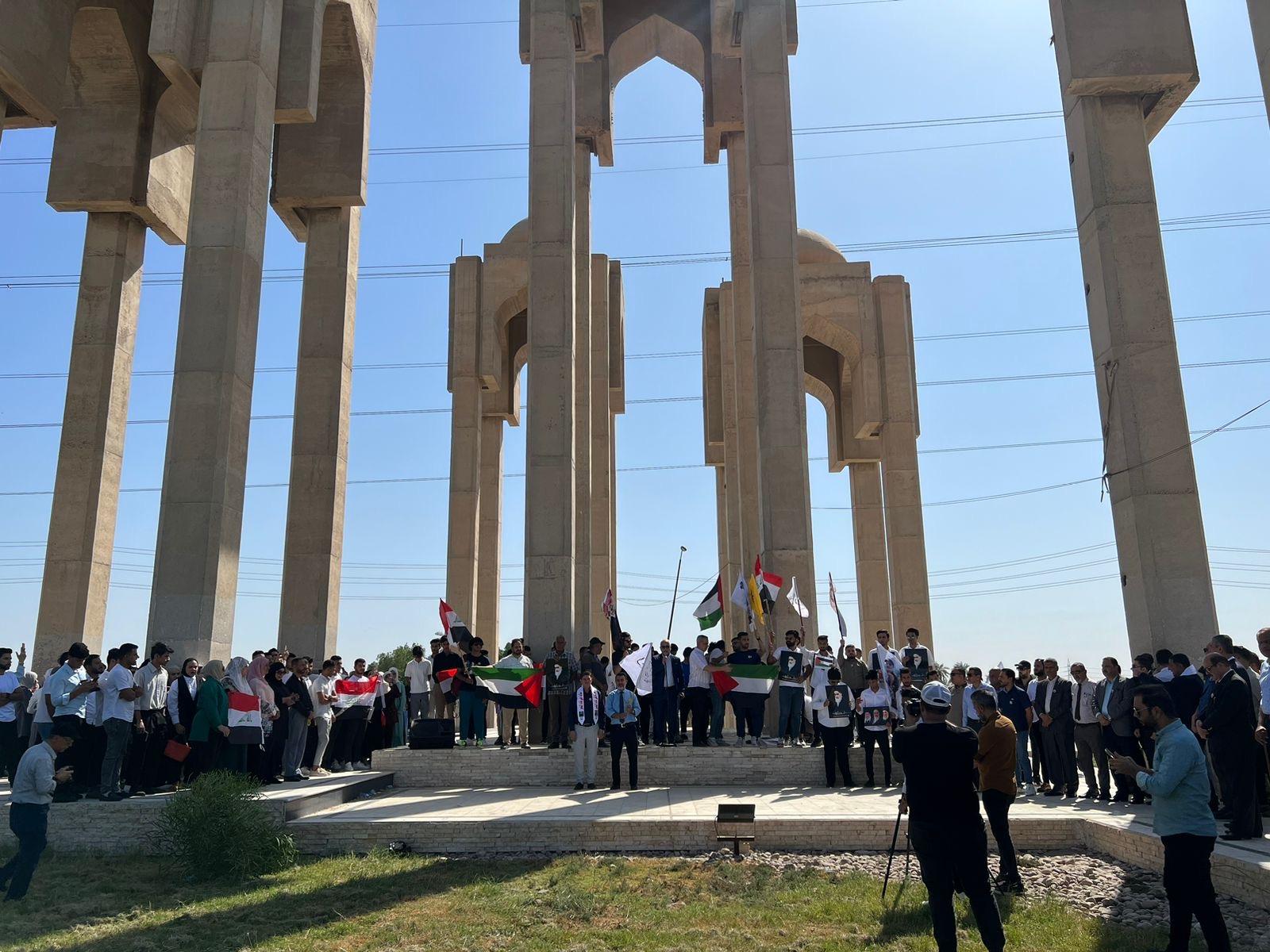 وشهد موقع مجمعات كرمة علي التجمع الرئيسي في وقفة حضرتها جميع عمادات وإدارات الكليات وأقسامها فضلا عن الطلبة مرددين شعارات وطنية وحماسية تساند عمليات طوفان الاقصى، فيما رفعت الاعلام الفلسطينية جنبا إلى جنب مع علم العراق مستذكرين المواقف البطولية للقوات العراقية في الأربعينات والسبعينات من القرن الماضي في الحرب ضد إسرائيل.