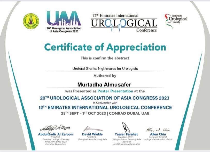 شارك السيد عميد كلية الطب الاستاذ الدكتور مرتضى محمد صالح المسافر وحصل على شهادة تقديرية لتقديمه عرض تقديمي في المؤتمر الاسيوي العشرون لجراحة المسالك البولية (UAA ) 2023. الذي استضافته دبي للمرة الأولى على مستوى الشرق الأوسط والخليج العربي وبالتزامن مع مؤتمر الإمارات الدولي الثاني عشر لجراحة المسالك البولية وذلك بمشاركة أكثر من 2500 طبيب من 75 دولة حول العالم وذلك خلال الفترة من 28 سبتمبر وحتى الأول من أكتوبر .