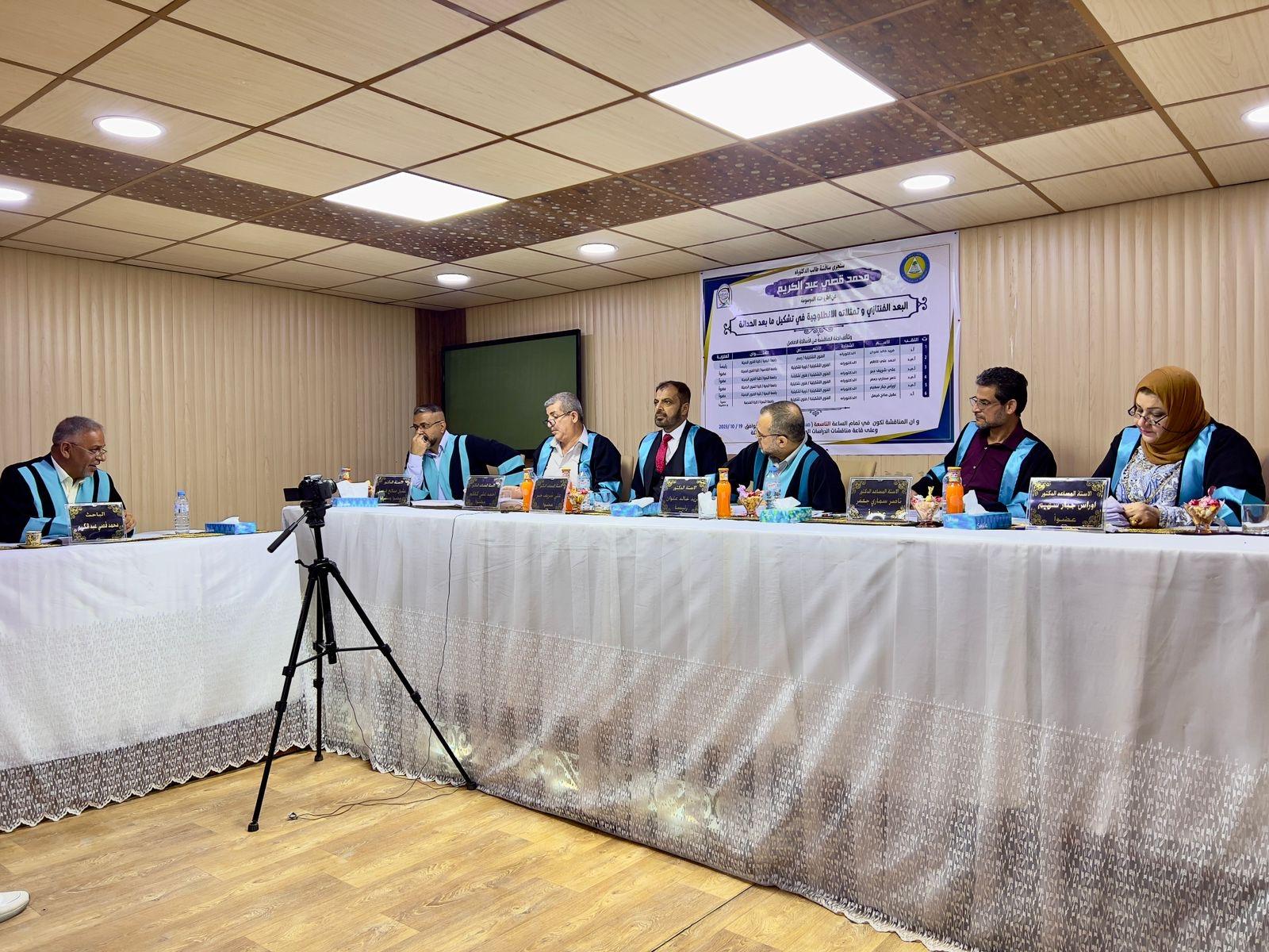 ناقشت أطروحة دكتوراه في كلية الفنون الجميلة بجامعة البصرة البعد الفنتازي وتمثلاته الأنطلوجية في تشكيل ما بعد الحداثة.
