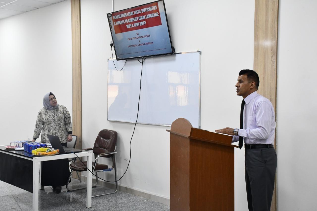 وتضمنت الحلقة النقاشية الذي قدمها المحاضران الأستاذ زينب سامي والمدرس أحمد فالح ربيع ان لا يمكن للمترجم القانوني أن يبدأ بترجمة أي نص قانوني بدون أي دراية كاملة بخصائص الخطاب القانوني. حيث تعتبر الخصائص القانونية العمود الفقري لممارسة الترجمة القانونية الاحترافية. إن لغة الخطاب القانوني تتميز رتابة وجمود في مفرداته التي لا يمكن تعديها أو استبدالها لأي غرض كان. فهذه القوالب القانونية هي ما يميز خطابها والذي غالبا ما يكون عسيرا على من هم خارج نطاق فهم واستخدام اللغة القانونية.