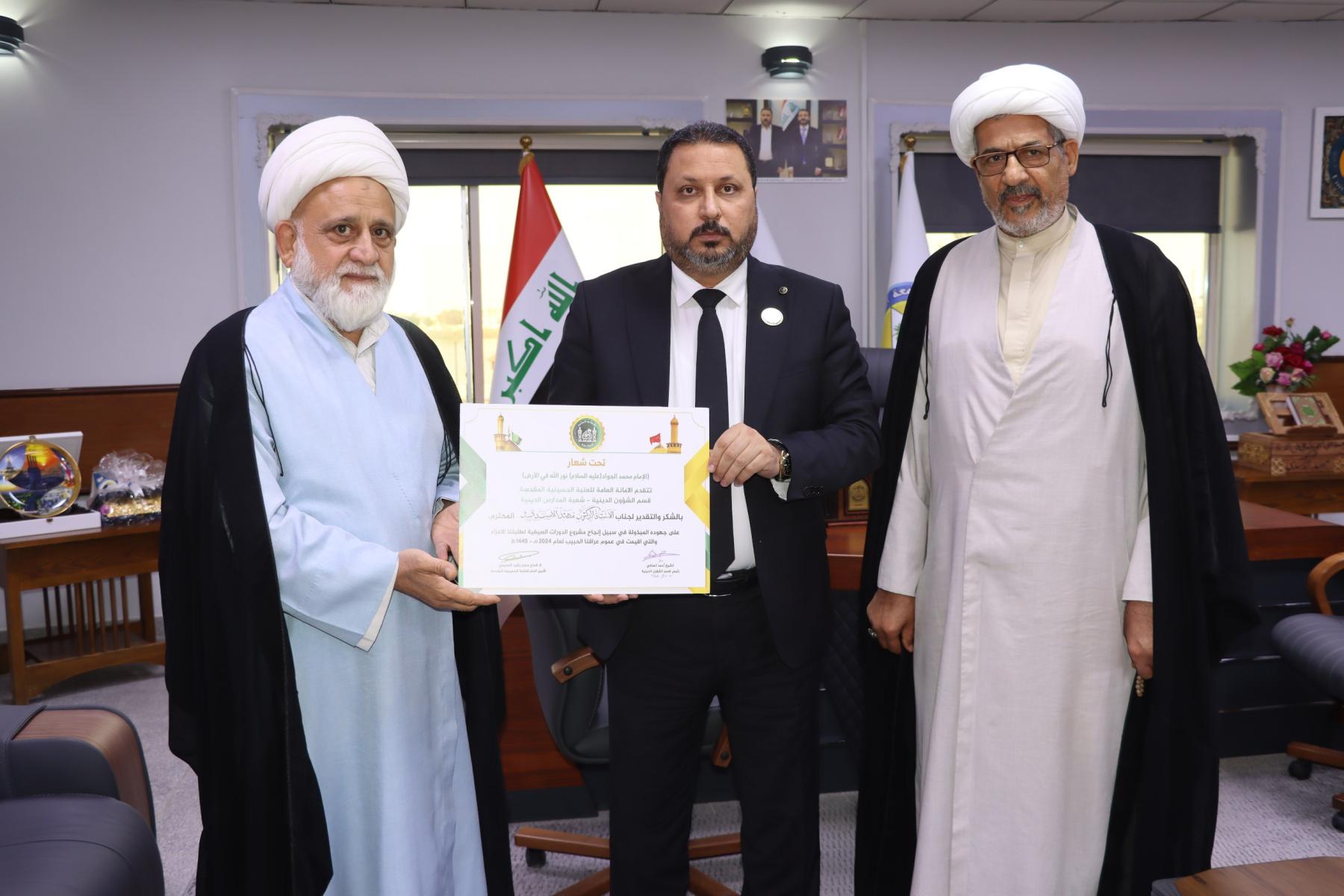 ومنح الوفد الزائر شهادة شكر وتقدير من الامانة العامة للعتبة الحسينية المقدسة لرئيس جامعة البصرة تقديراً لجهوده التي يقوم بها خدمةً للتعليم العالي في محافظة البصرة ورعايته للنشاطات الثقافية والمحافل الدينية ودعمه لتنفيذ المحاضرات التوجيهية للطلبة.