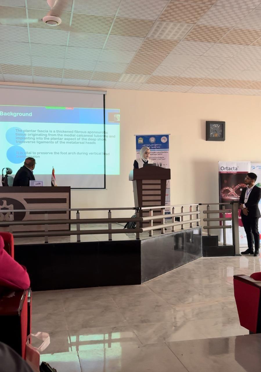وتضمنت المشاركة القاء بحث بعنوان العلاقة بين التهاب اللفافة الأخمصية من ناحية الخصائص السريرية والوظيفية مع طول النتوء العقبي في مدينة البصرة.