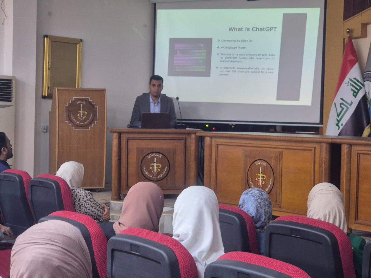 وتضمنت الورشة التي حاضر فيها التدريسي محمد عدنان عبد الوهاب كيفية استخدام الاداة ChatGPT للتسجيل في الموقع الالكتروني وكيفية استخدامها في البحث العلمي لانشاء النصوص وتلخيص البحوث وتقليل الاخطاء الاملائية وبيان دورها في مساعدة الباحثين في دقة التوثيق وتوفير الجهد والوقت.