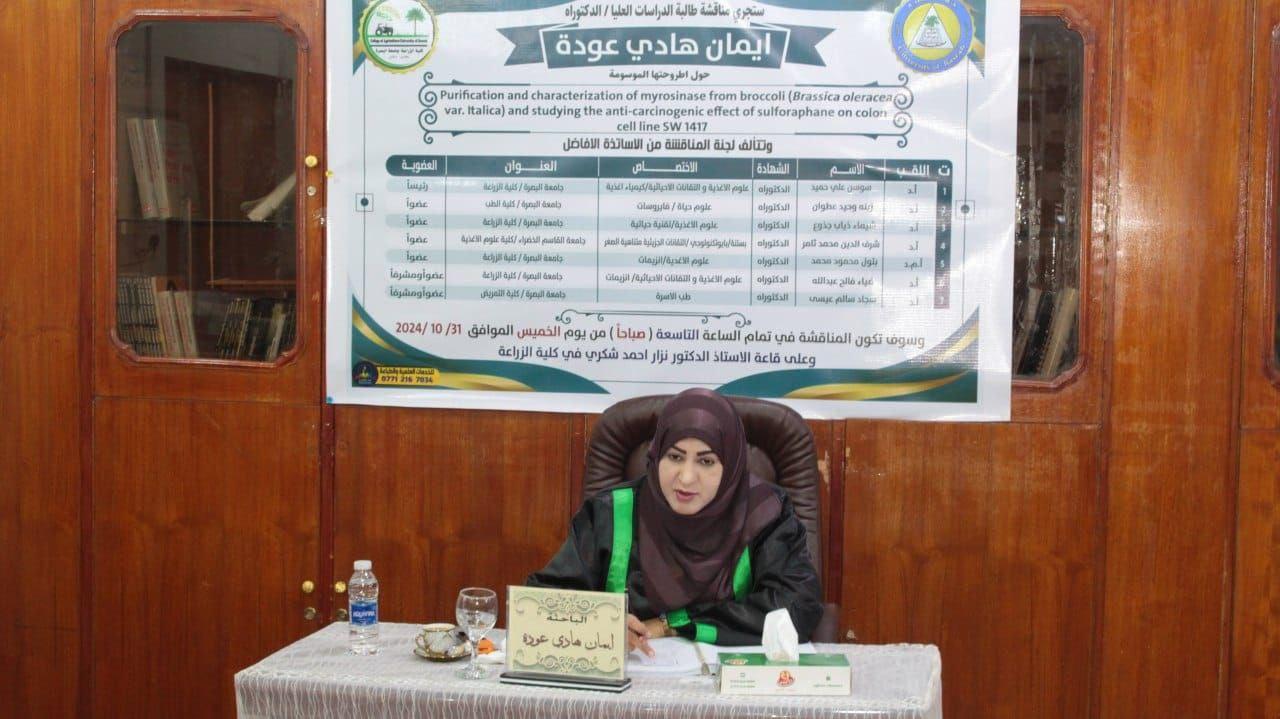 وتهدف الاطروحة التي قدمتها الطالبة إيمان هادي عودة الى تنقية انزيم الماروسينيز العلاجي من البروكلي ودراسة خصائص الانزيم المنقى المثلى.