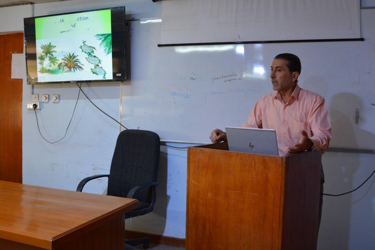 وتضمنت الورشة التي قدمها الدكتور أحمد يوسف لفتة شرحا لتركيب الاحماض النووية وموقعها في الخلية وطرق استخلاص الاحماض النووية كيميائيا وفيزيائيا في الانسجة النباتية باستعمال تقنية أجيال التسلسل الجيني