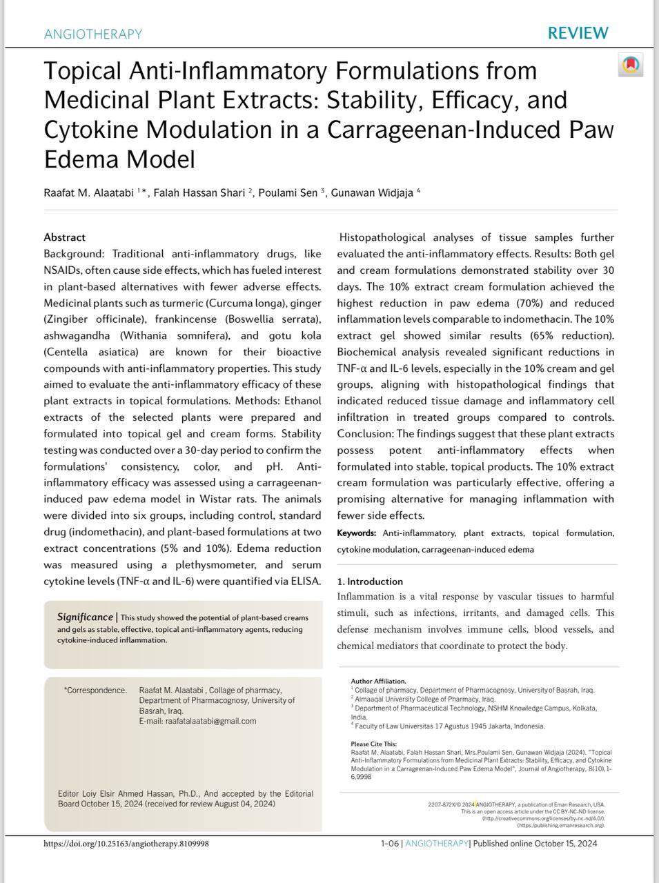 نشر التدريسيان في كلية الصيدلة بجامعة البصرة الدكتور فلاح حسن شري والتدريسي رأفت محمد بحثاً بعنوان (التراكيب الموضعية المضادة للالتهابات من مستخلصات النباتات الطبية: الاستقرار، الفعالية، وتعديل السيتوكينات في نموذج الوذمة المحفزة بالكارجينان في الأقدام) في مجلة Angiotherapy الاسترالية وضمن الربع الرابع لتصنيف سكوباس.