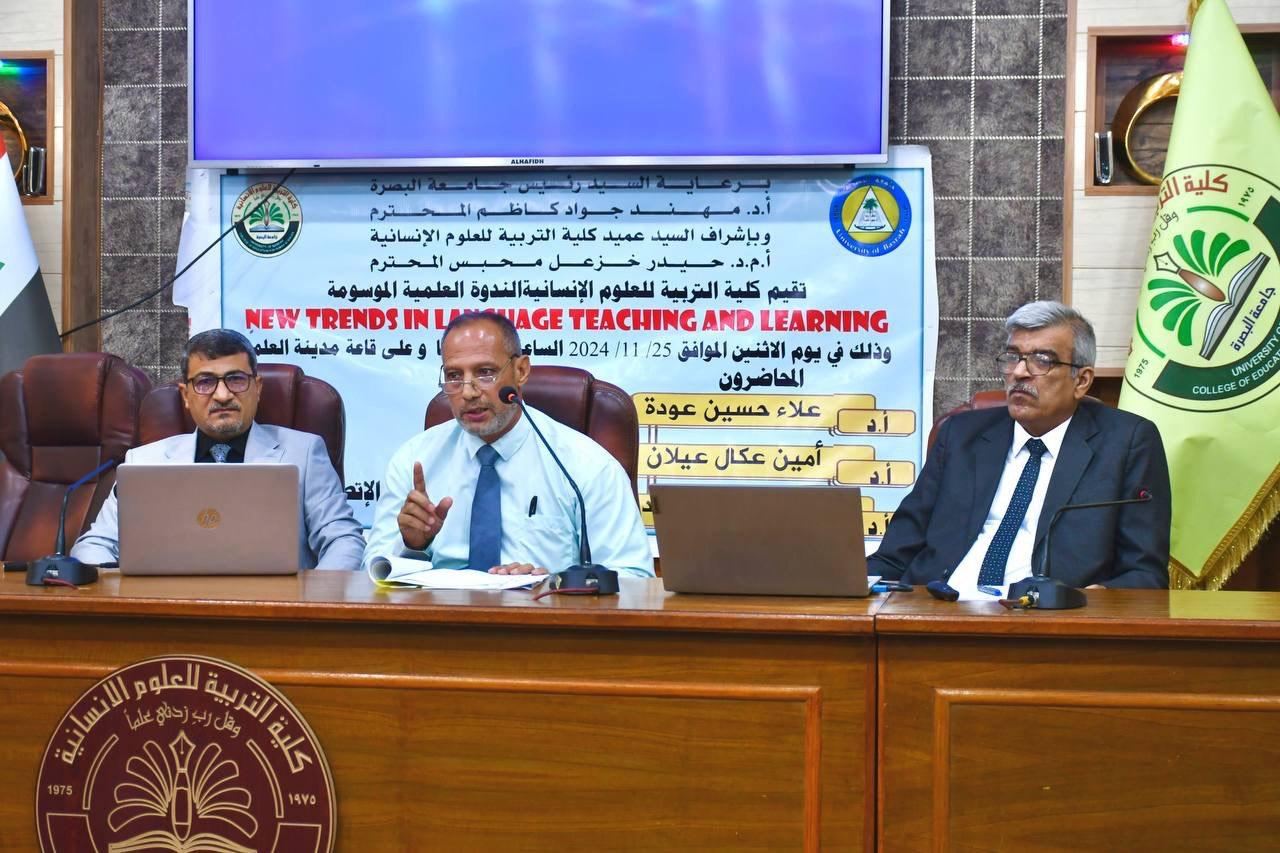 نظمت كلية التربية للعلوم الإنسانية في جامعة البصرة ندوة علمية عن الاتجاهات الحديثة في تدريس وتعلم اللغة بحضور مساعد رئيس الجامعة للشؤون العلمية الدكتور علي حسين رشك ومساعد رئيس الجامعة للشؤون الادارية الدكتور حيدر خزعل الكعبي.