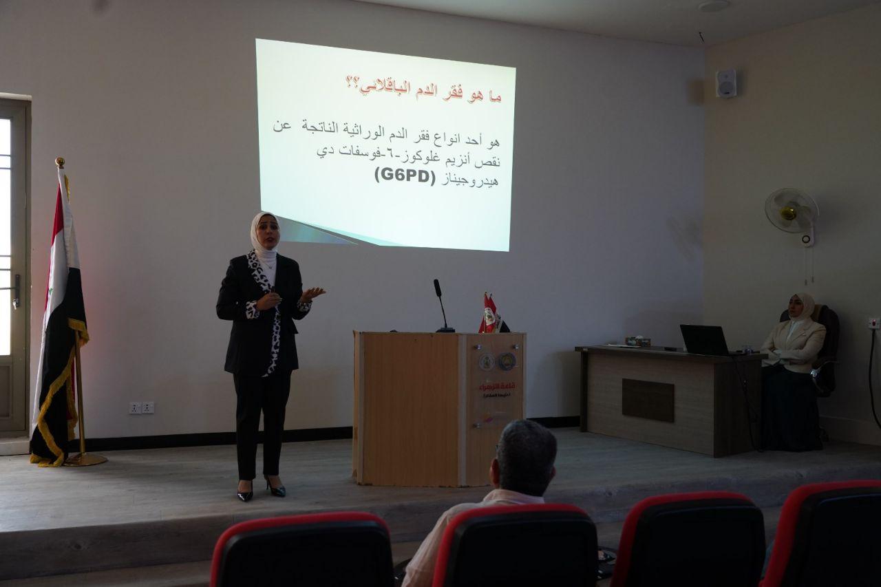 وتضمنت الندوة محاضرتين قدمهما الدكتور سعد عبد الله والدكتور الاء عبد الرزاق بينا خلالهما فقر الدم الباقلائي اسبابه واعراضه وعلاجه فضلا عن التعريف بأهم الامراض الوراثية المنتشرة في الوقت الحاضر حيث من الملاحظ ان هناك زيادة في نسبة حدوث هذه الامراض خصوصاً في المناطق الريفية التي يكون فيها نسبة زواج الاقارب كبيرة.