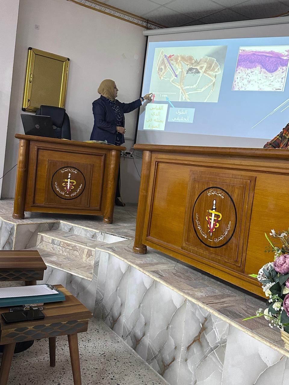 وتناولت الورشة التي حاضر فيها كل من الدكتور مصطفى صدام والدكتورة ازل ناصر آلية استعمال مقياس الرسم ومعايرة العدسة العينية والشيئية وكيفية الاستفادة منهم في البحوث العلمية كونه اكثر دقة في تحديد القياسات الدقيقة.