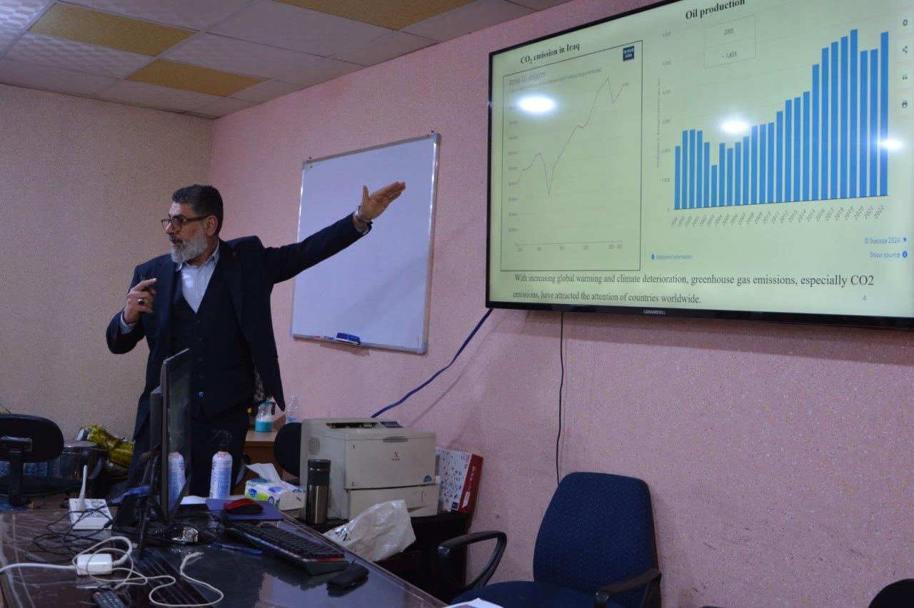 واستعرض المشروع الذي قدمه الدكتور داود سلمان بناي إمكانية استثمار تقنية خزن ثاني أكسيد الكربون كأحد الوسائل البيئية المبتكرة التي تعتمد على جمع ( CO₂ ) من مصادر صناعية مثل محطات الطاقة والمنشاّت النفطية وغيرها، ثم تخزينه بشكل دائمي وآمن في الطبقات الصخرية ( التكاوين الجيولوجية ) العميقة بهدف تقليل كميات الكربون المنبعثة إلى الغلاف الجوي مما يساهم في الحد من الاحتباس الحراري والتغيرات المناخية المرتبطة به.
