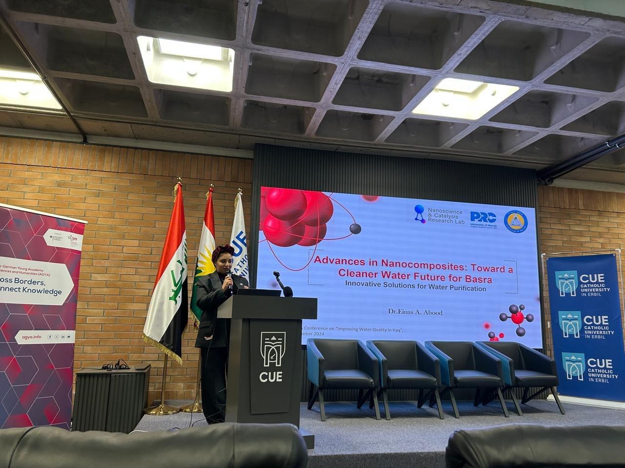 شاركت التدريسية في مركز أبحاث البوليمر بجامعة البصرة الدكتورة إيناس عبد العزيز عبود في مؤتمر (AGYA) الدولي تحت عنوان (تحسين جودة المياه في العراق) والذي عقد في الجامعة الكاثوليكية في أربيل بمشاركة باحثين من جامعات عراقية وعربية والمانية.