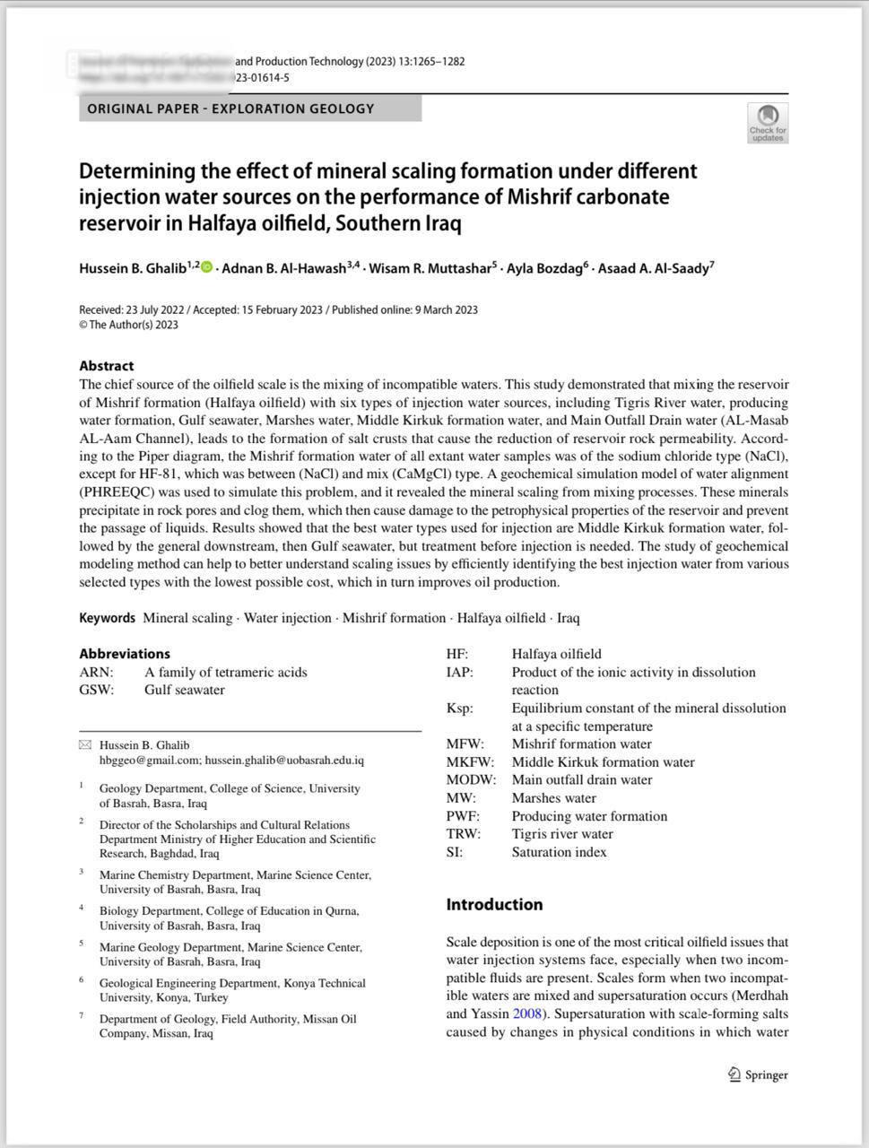 بحثت دراسة علمية في جامعة البصرة اعدها الدكتور عدنان بدر غالب في كلية تربية القرنة بجامعة البصرة تحديد تأثير تكوين القشور المعدنية تحت مصادر مياه الحقن المختلفة على أداء مكمن كربونات المشرف في حقل الحلفاية النفطي جنوب العراق.