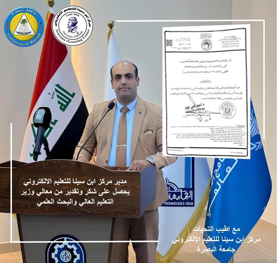 حصل مدير مركز ابن سينا للتعليم الالكتروني في جامعة البصرة الدكتور عدي بشير عيسى على كتاب شكر وتقدير من وزير التعليم العالي والبحث العلمي.
