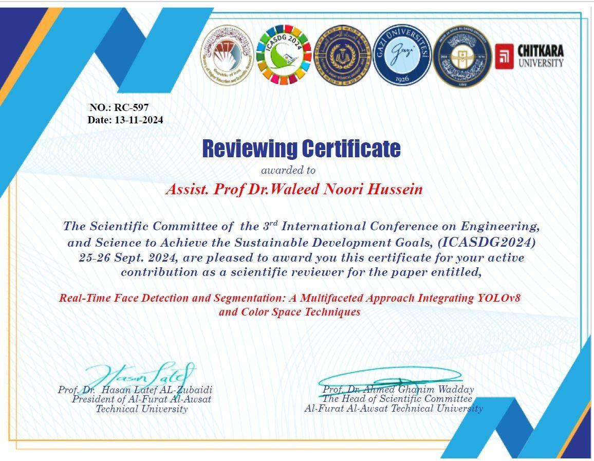 وقال الدكتور وليد الهاشمي ان اللجنة التحضيرية للمؤتمر منحته شهادة تقديرية تثمينا لمساهمته الفاعلة كمقيم علمي للبحث الموسوم" اكتشاف الوجه في الوقت الحقيقي وتقسيمه: نهج متعدد الجوانب يدمج YOLOv8 وتقنيات الفضاء اللوني"