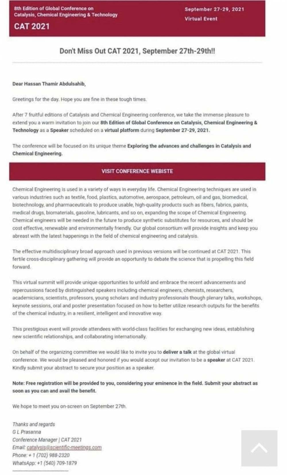 تدريسي في جامعة البصرة عضواً في المؤتمر الدولي للعوامل المساعدة والهندسة الكيميائية والتكنولوجيا...