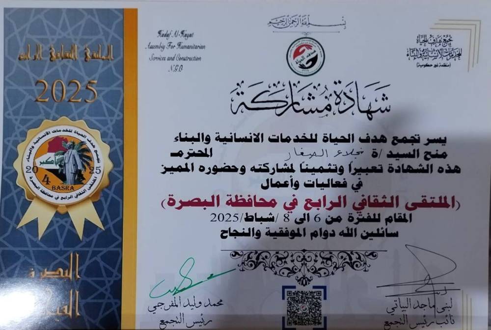 تدريسية في جامعة البصرة تحصل على شهادة تقديرية من منظمة تجمع هدف الحياة ...