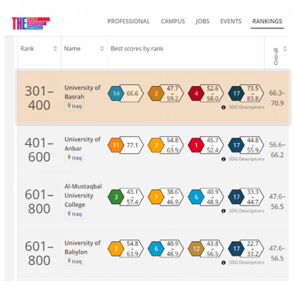 جامعة البصرة تتصدر الجامعات العراقية بتصنيف التايمز امباكت للعام 2021 ..