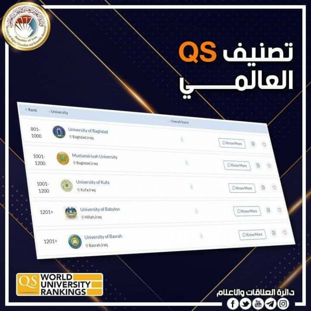 كشف تصنيف (QS) العالمي للجامعات عن نتائجه الخاصة بنسخة العام 2022 التي أظهرت جامعات عراقية في مقدمتها جامعة بغداد وتليها ..