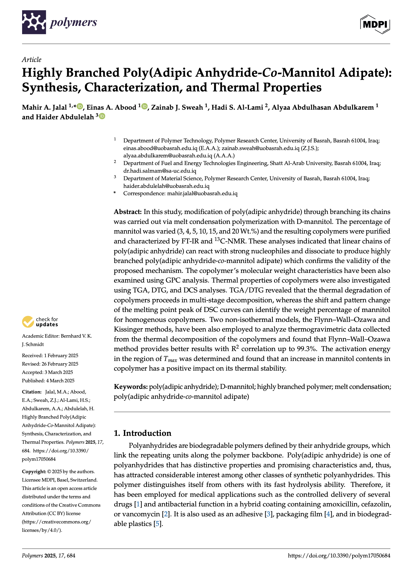 وذلك في مجلة Polymers الصادرة عن دار النشر العالمية MDPI، والمصنفة ضمن مستوعبات Scopus وWeb of Science (Q1) ، في عددها لشهر آذار 2025 ، ويتناول البحث تحسين الخصائص الحرارية لبوليمر الادبك من خلال تغير البنية التركيبة له وجعلة عالي التفرع من خلال تفاعل تكاثفي بالانصهار بين بولي أنهدرايد الأدبك ومادة D-Mannitol ويأتي هذا البحث ضمن جهود المركز في تطوير مواد بوليمرية مبتكرة ومستدامة قابلة للاستخدام في التطبيقات الطبية والصناعية.