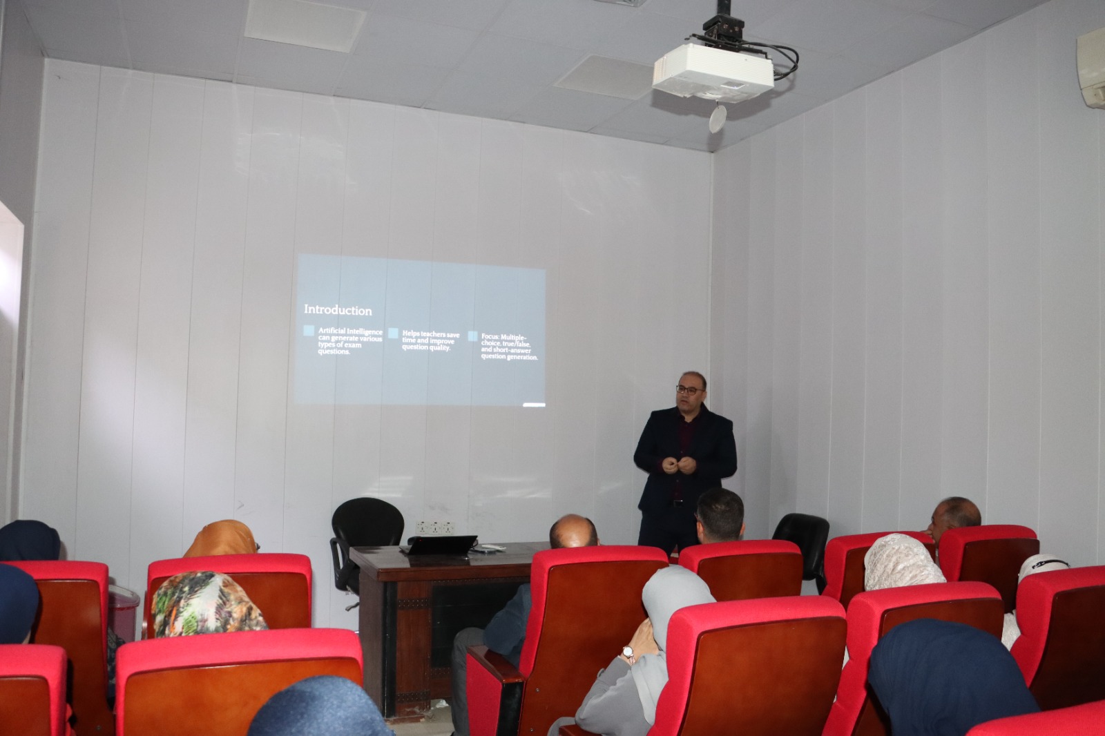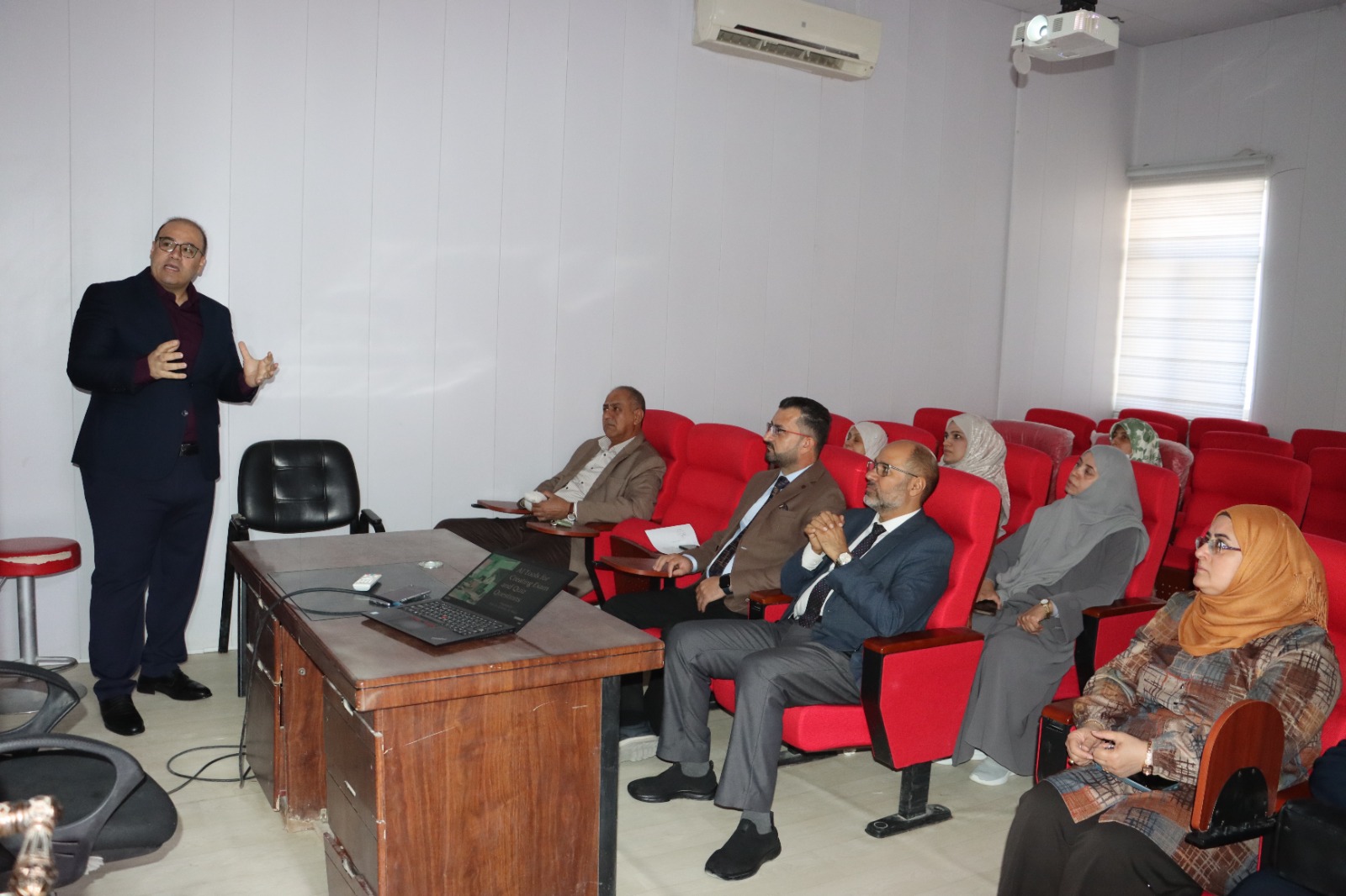استعرض الدكتور قتيبة عبد الكريم قاسم خلال الورشة آليات توظيف أدوات الذكاء الاصطناعي المتقدمة في صياغة أسئلة الـ (MCQ) للأغراض السريرية والصيدلانية، مع تطبيقات عملية حية أمام المشاركين لبيان سرعة ودقة هذه التقنيات الحديثة.