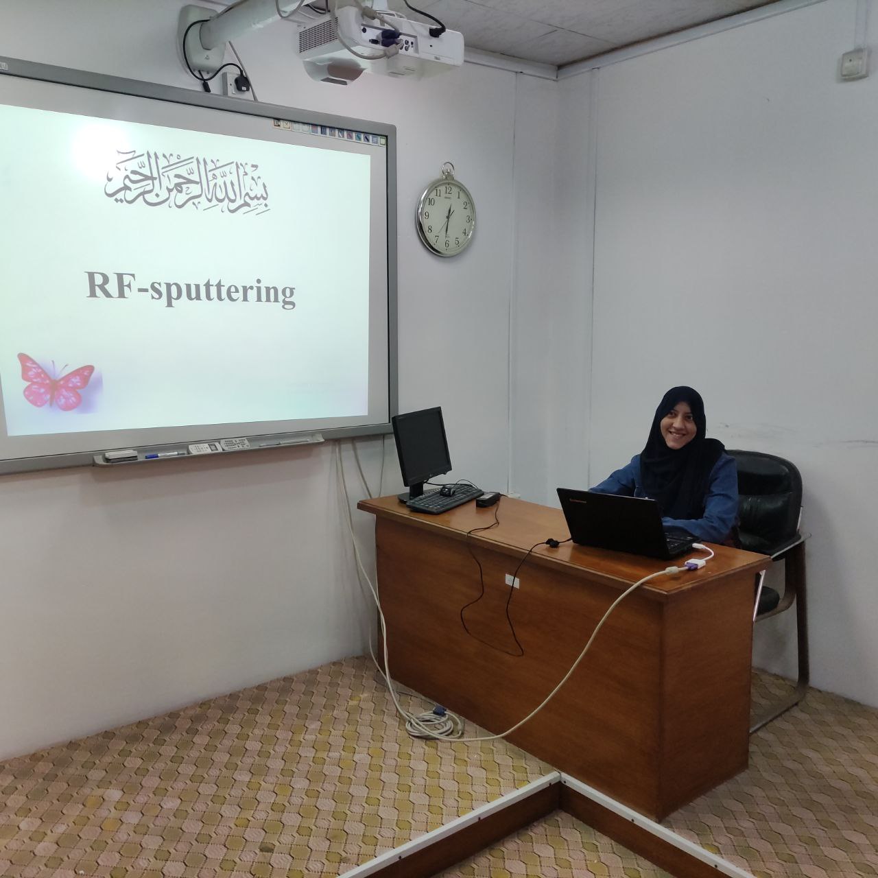 نظم مركز أبحاث البوليمر في قاعة السمنار محاضرة أعدتها التدريسية د. رونق عدنان طالب تضمنت شرح استخدام جهاز RF Sputter وهو جهاز يستخدم لترسيب الأغشية الرقيقة باستخدام (Target) الهدف من مواد مختلفة سواء اشباه موصلات او عوازل وكذلك يستخدم لترسيب الأقطاب باستخدام هدف من المواد الموصلة وتتم عمليه الترسيب في كلتا الحالتين بدرجة حراره الغرفة او بدرجات حراره مختلفة ويمكن الحصول على سمك مختلف من الغشاء حسب متطلبات الباحث. حيث ان مبدأ عمل الجهاز هو تحويل ذره غاز الاركون إلى ايون الأركون وإطلاق إلكترونات حره وبالتالي توليد الحالة الرابعة من المادة وهي البلازما فيقلع ايون الأركون جزء من مادة الهدف وترسيبها نحو القواعد.