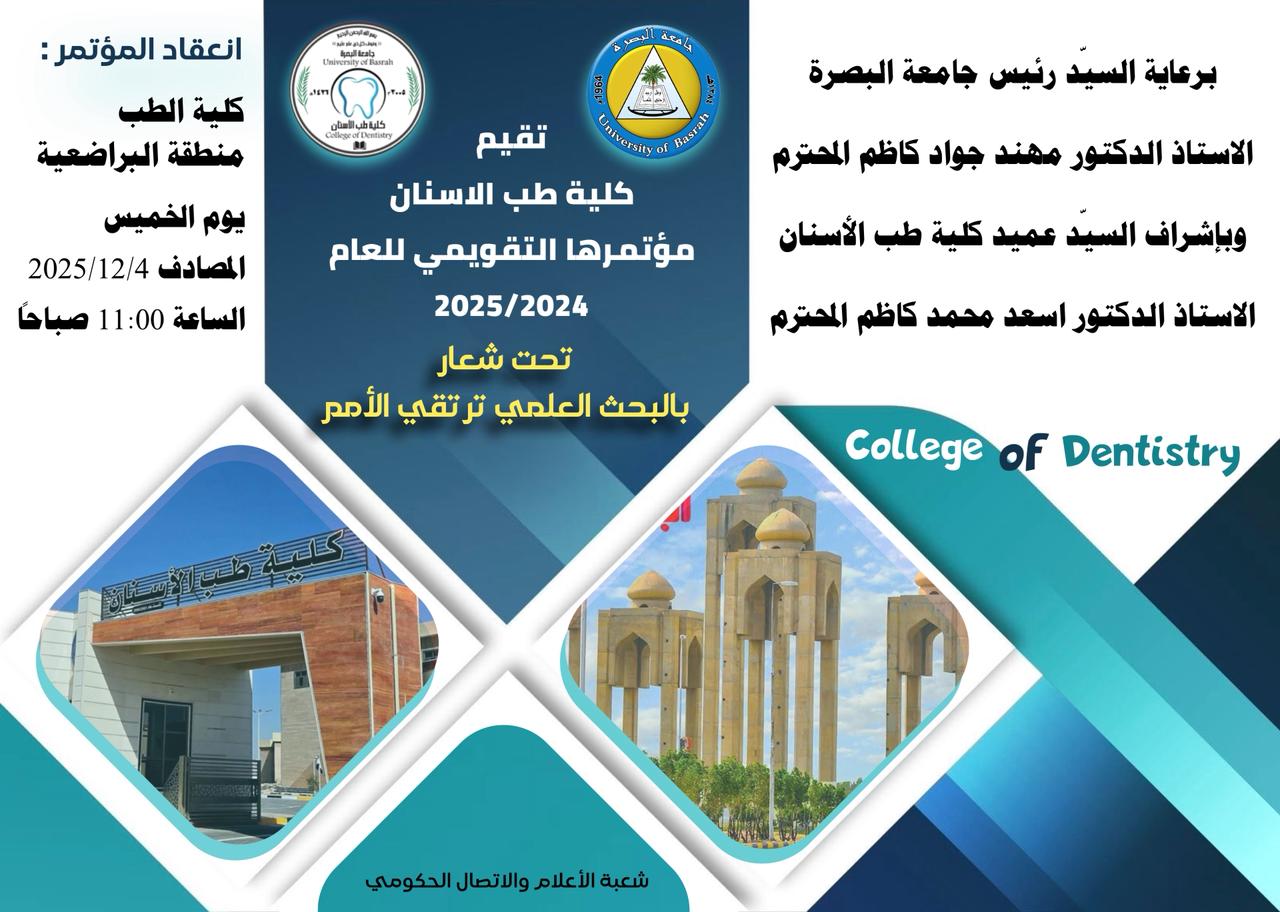 ستقيم كلية طب الاسنان مؤتمرها التقويمي للعام الدراسي 2024-2025 تحت شعار (بالبحث العلمي ترتقي الامم)