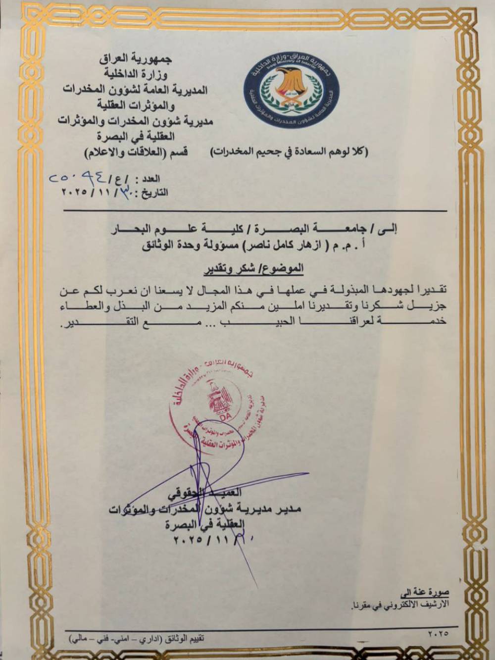 عميد كلية علوم البحار في جامعة البصرة يحصل على كتاب شكر وتقدير من وزارة الداخلية ...